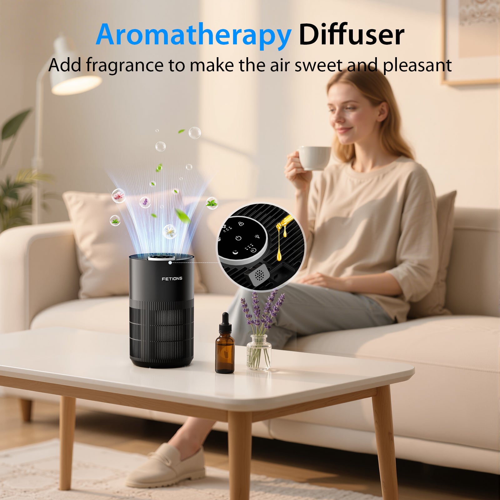 Fetions air purifier operates at a noise level as low as 24 decibels, providing a quiet and comfortable environment—making it the ideal choice for a restful night’s sleep. The unit features a built-in essential oil tray where you can add a few drops of essential oil, filling the room with a soothing, pleasant fragrance while purifying the air.