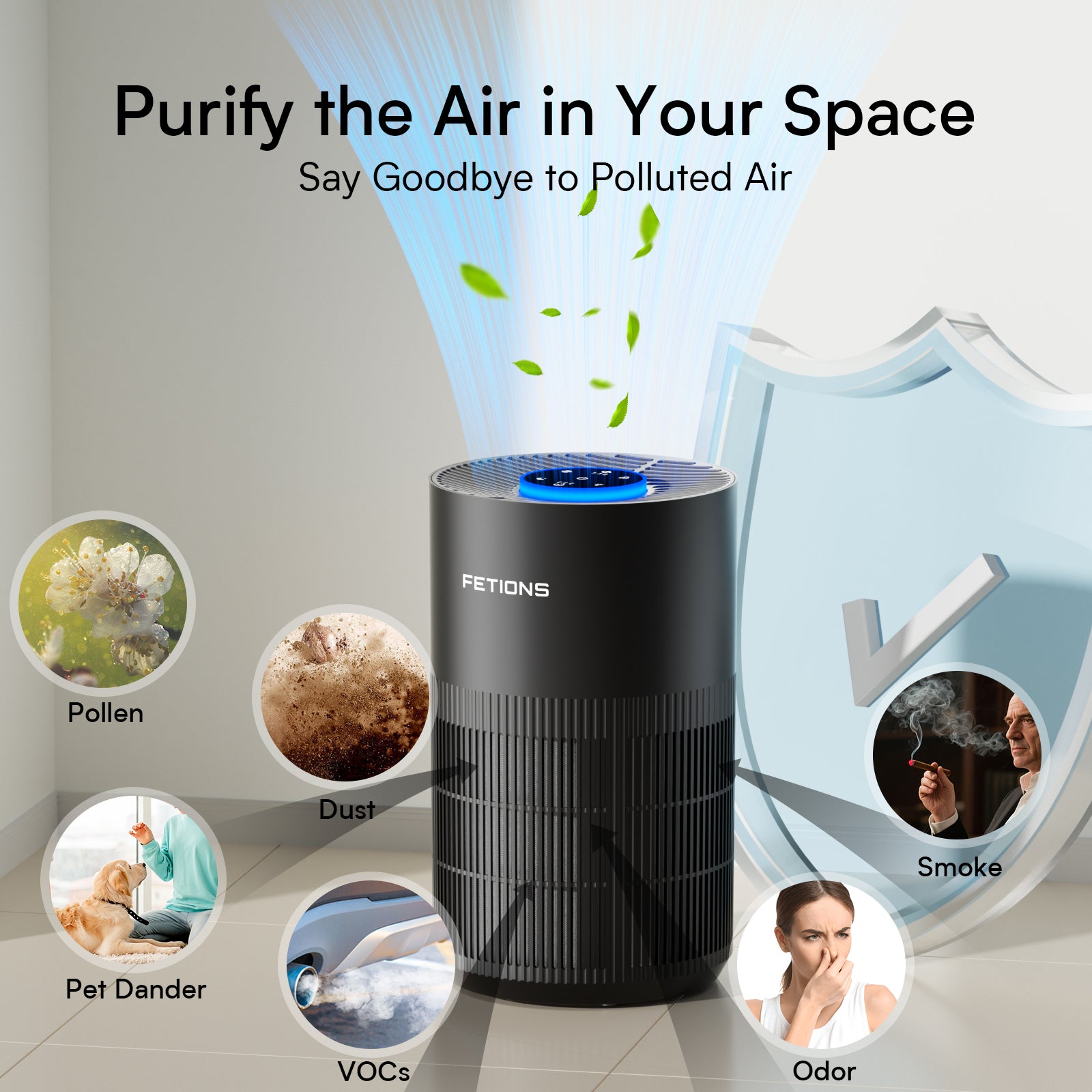 Fetions air purifier is equipped with an advanced three-stage H14 HEPA filtration system that effectively captures 99.97% of airborne pollutants, including pollen, dust, smoke, pet hair, and dander, creating a clean and fresh indoor environment for you.
